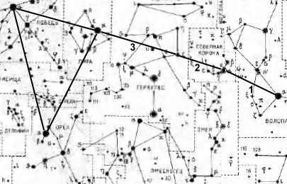 Созвездие Северной Короны найти достаточно просто. Для начала отыщем звезду Арктур – самую яркую не только в созвездии Волопаса, но и во всём северном полушарии неба. Арктур (на рис. 6 – справа) расположен на продолжении хвоста Большой Медведицы. Теперь восточнее (левее) найдём звезду практически одинаковой с Арктуром яркости – Вегу. Вега – одна из звёзд Летне-Осеннего треугольника и является самой яркой в созвездии Лиры. Также в данный треугольник входят Денеб (в созвездии Лебедя) и Альтаир (созвездие Орла). Вега и Денеб в наших широтах не заходят за горизонт, тогда как Альтаир расположен значительно южнее, поэтому появится ближе к лету. На рис. 6 Вега – правая из двух верхних вершин треугольника (в левой части карты). На линии, соединяющей Вегу и Арктур, видны две звезды средней яркости, делящие линию “Арктур-Вега” на три почти равные части (на карте эти части отмечены цифрами 1, 2 и 3 соответственно). Звезда между отрезками “2” и “3” – ζ Геркулеса. Немного севернее (выше) неё можно найти знаменитое шаровое звёздное скопление M 13, содержащее около 500 тысяч звёзд. Это скопление заметно в любой оптический инструмент (рис. 7). А вот звезда между отрезками “1” и “2” – Альфекка (Гемма) – самая яркая в Северной Короне и примерно такая же яркая, как звёзды ковша Большой Медведицы.