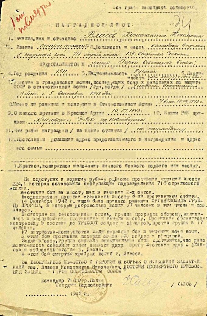 Второй из оставшихся в живых – наш земляк, сержант Константин Николаевич Власов (1911–1978). Он родился в с. Могочино ныне Молчановского района Томской области в крестьянской семье. Окончил семь классов Могочинской средней школы. В Могочино работал продавцом в потребкооперации, завклубом, уполномоченным по лесозаготовкам на Могочинском лесозаводе. В октябре 1934 г. был призван в РККА, служил до октября 1936-го. По возвращении из армии стал начальником боевой подготовки в Кривошеинском Совете Осоавиахима. С 1937 г. работал на Комбинате № 179 в Новосибирске.3 В комсомольской организации с 1928 года, член ВКП(б) с 1941-го. На фронт ушёл добровольцем в июле 1943 г. Боевое крещение получил 5 сентября 1943 г.