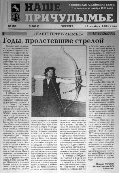 В 1978 году, выступая на очередных соревнованиях в Пятигорске, Мария Ивановна выполнила норматив мастера спорта, став первой и единственной асиновской женщиной-лучницей с таким по-настоящему огромным достижением. Она была всесоюзной чемпионкой на своей любимой короткой дистанции 50+30 метров, являлась членом сборной Томской области и Советского Союза. За 20 лет работы воспитала 7 кандидатов в мастера спорта и множество разрядников. А Владимир Александрович демонстрировал успехи не только в стрельбе из лука, где он выполнил норматив КМС, но ещё и в шахматах. Любил вести игру по переписке, находя себе соперников в разных уголках страны.