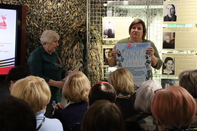 Рассказ подхватила Ольга Сулакшина-Калинина, которая провела небольшую экскурсию по фотовыставке, размещенной на планшетах. Женщины — члены Координационного совета собрали информацию о своих родственницах, которые в годы войны трудились на заводах и шахтах, жили в оккупации, спасали раненых на поле боя и в госпиталях.