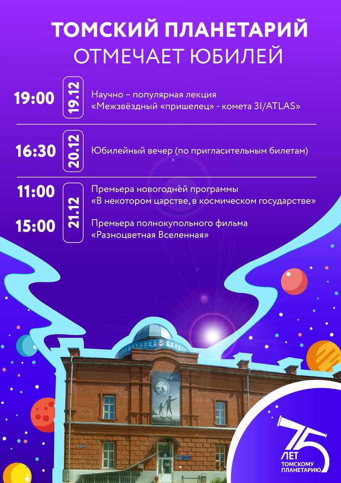19 декабря начинаются юбилейные торжества в честь 75-летия Томского планетария — отдела Томского областного краеведческого музея имени М.Б. Шатилова. Гостей планетария в эти дни ждут научно-популярная лекция, новогодний спектакль для детей, премьеры полнокупольных фильмов и юбилейный вечер.