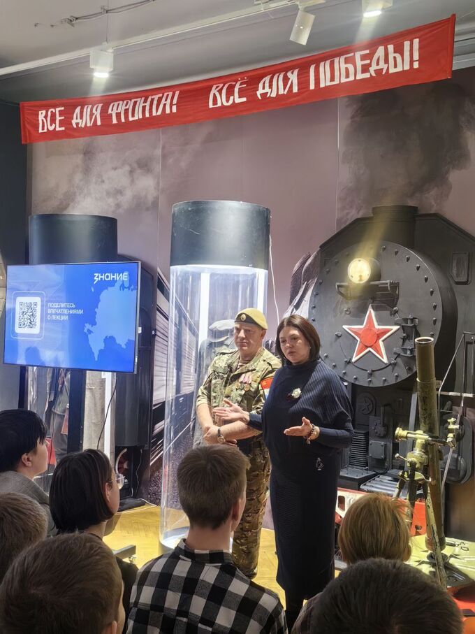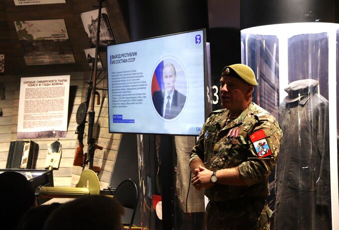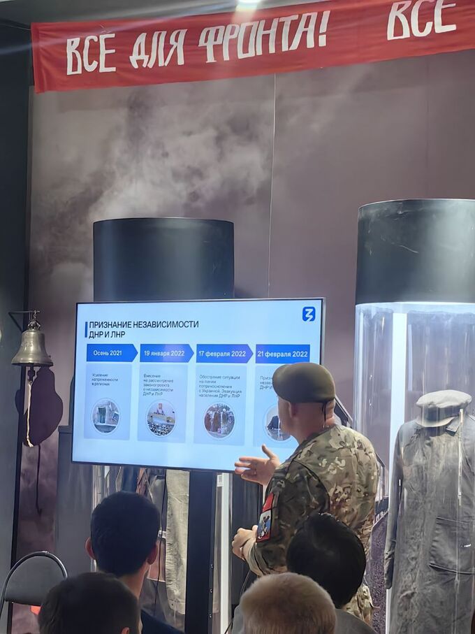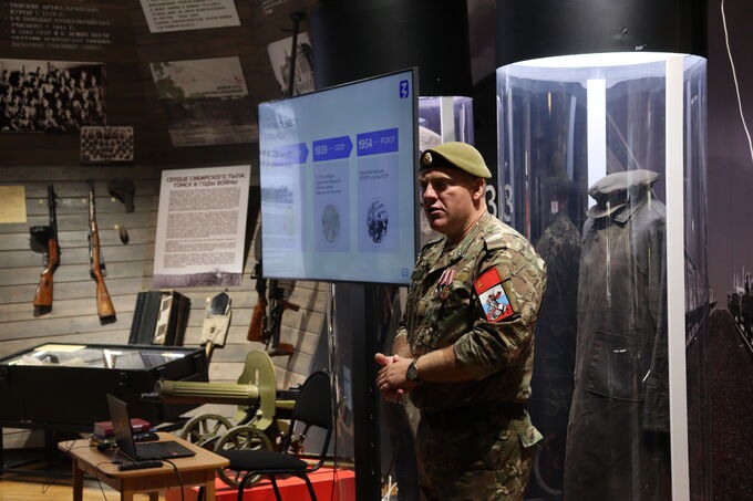 По окончании встречи старший научный сотрудник ТОКМ Константин Подковыркин провел экскурсию по выставке «Маяки русского мира. Возрождение», посвященной трехлетию вхождения в состав Российской Федерации ДНР, ЛНР, Запорожской и Херсонской областей.