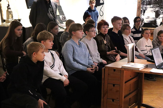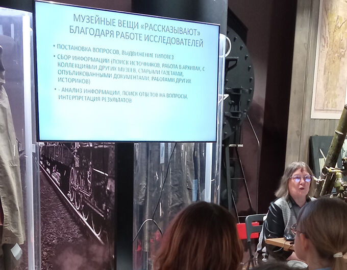 Об истории создания книги «100 музейных историй. Предметы. Люди. Сибирь» рассказала заведующая научно-исследовательским отделом ТОКМ, кандидат исторических наук Елена Анатольевна Андреева, прозвучали полезные советы для юных ученых. О предметах, представленных на выставке «Сердце сибирского тыла. Томск в годы войны», рассказала старший научный сотрудник Зоя Алексеевна Игнатенко.