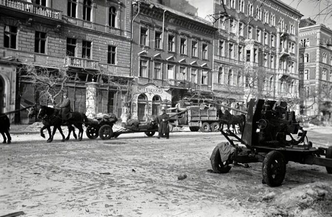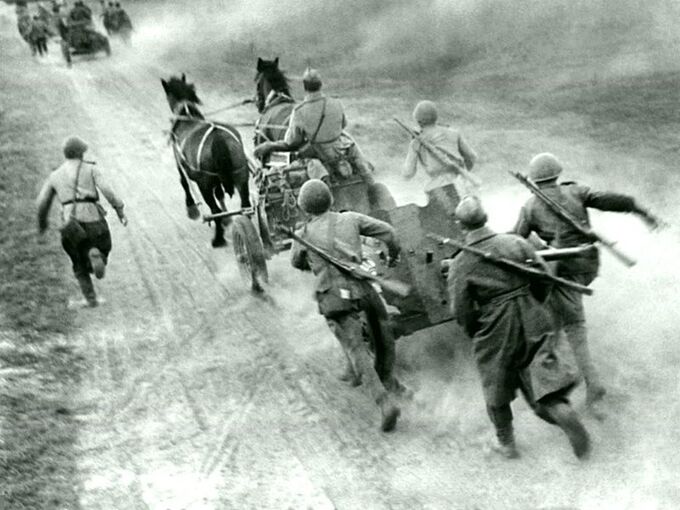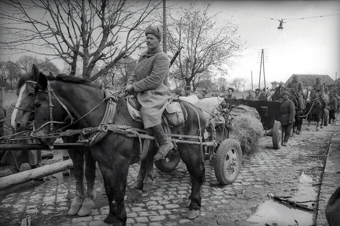 Не надо думать, что задачей ездового были лишь крестьянские заботы по уходу за лошадьми да перевозка орудия в указанное командиром место. У каждого бойца артиллерийского расчёта были чёткие обязанности, от исполнения которых зависели и выполнение боевых задач, и жизнь всего подразделения в целом. У ездового – тоже. Например, в ходе сражений орудию, местонахождение которого было раскрыто противником, приходилось срочно менять позицию. И делать это надо было максимально быстро. Посмотрите на публикуемую здесь документальную фотографию 1944 г., снятую во время боёв за г. Клайпеду. Как мчатся лошади и люди при такой передислокации! И главенствующую роль здесь играет ездовой. Не дай бог подведёт лошадь, упряжь или он сам. В его руках уже не вожжи, а в самом прямом смысле успех боя и жизнь расчёта. А во время сражений ездовому не раз и не два приходилось заменять убитых или раненых бойцов своего расчёта и от своего четвероногого транспорта бежать к орудию.