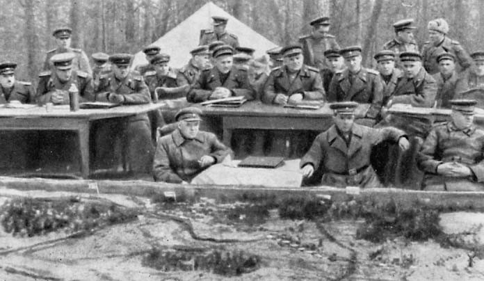фронта генерал-лейтенант В.Д. Соколовский отрабатывают с офицерами тактические