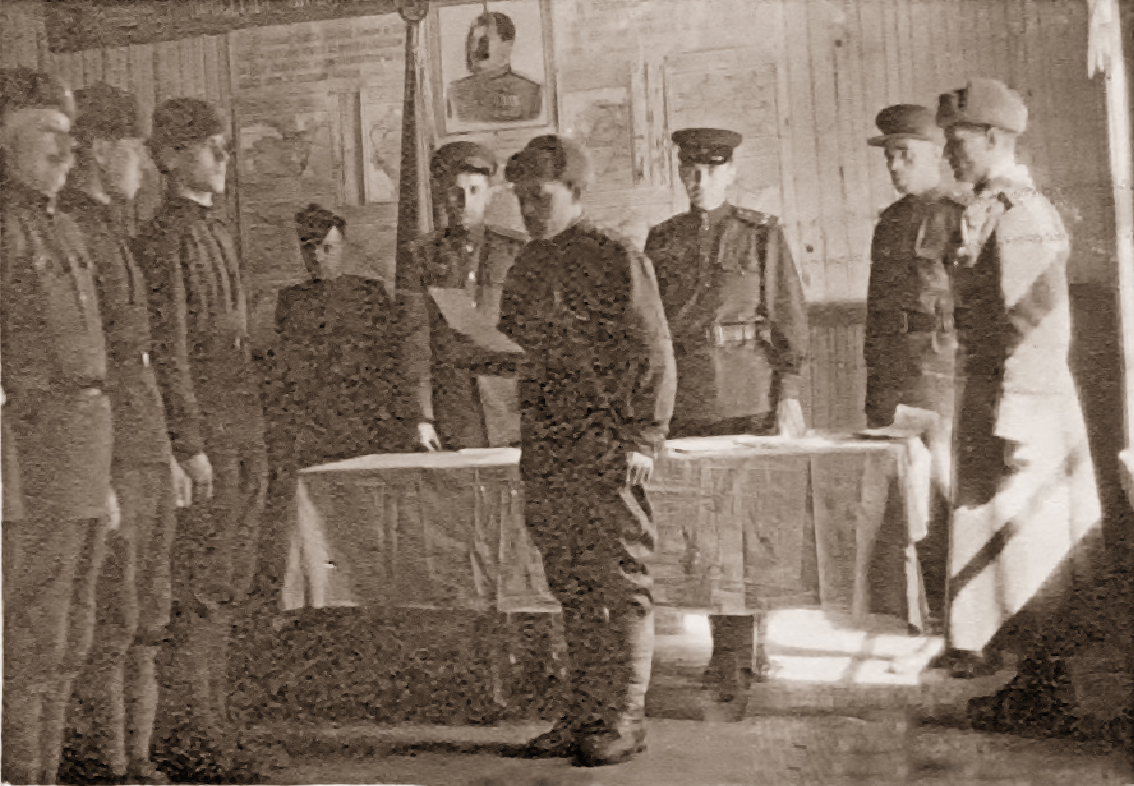 За столом (в центре) – командир отряда подполковник В.П. Родюков. 1945 г